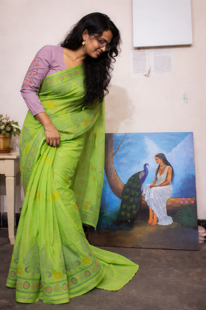 Hand-Painted Muslin Saree: Saraswati