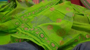 Experience the sheer elegance of Authentic Muslin, a fabric so fine and breathable it feels like a second skin. This vibrant lime green saree from KhatiBaazaar combines the ancient art of Hand-Block Batik with the regal heritage of Muslin, making it a masterpiece of traditional craftsmanship.